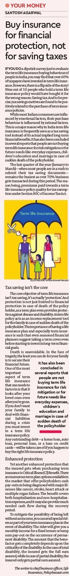 Though low premium may seem attractive, it should not be the guiding factor while buying a policy. Once you decide that you need a certain level of cover, look for the options that are available online as well as offline. Depending on your affordability, choose plans that offer suitable premiums. "Assess your need and asset-liability situation while buying insurance," says Kumar.
