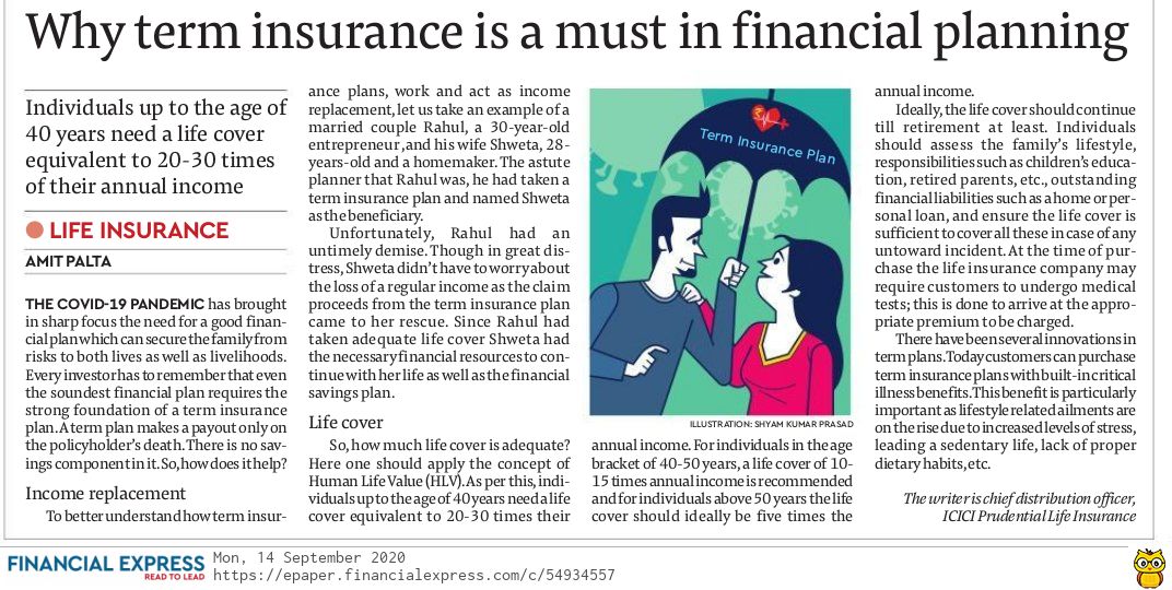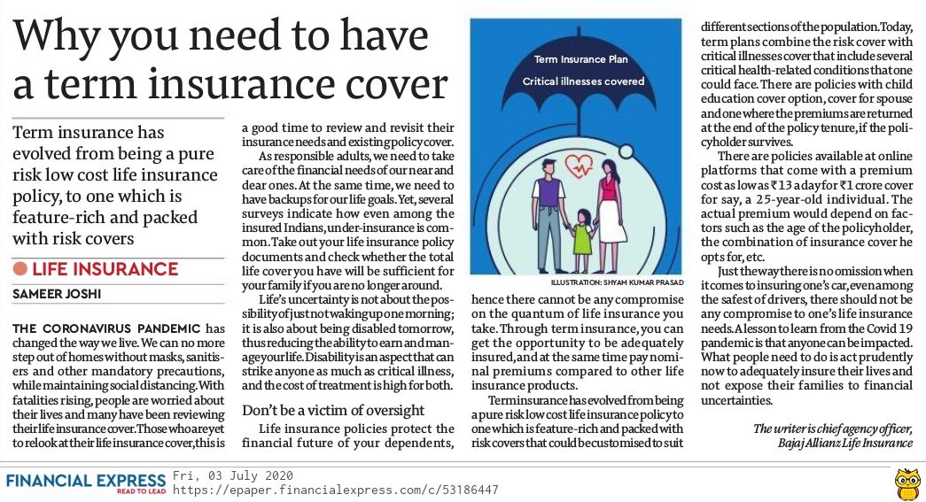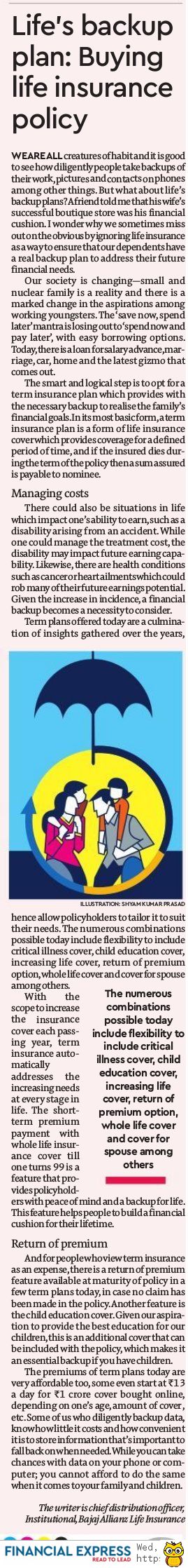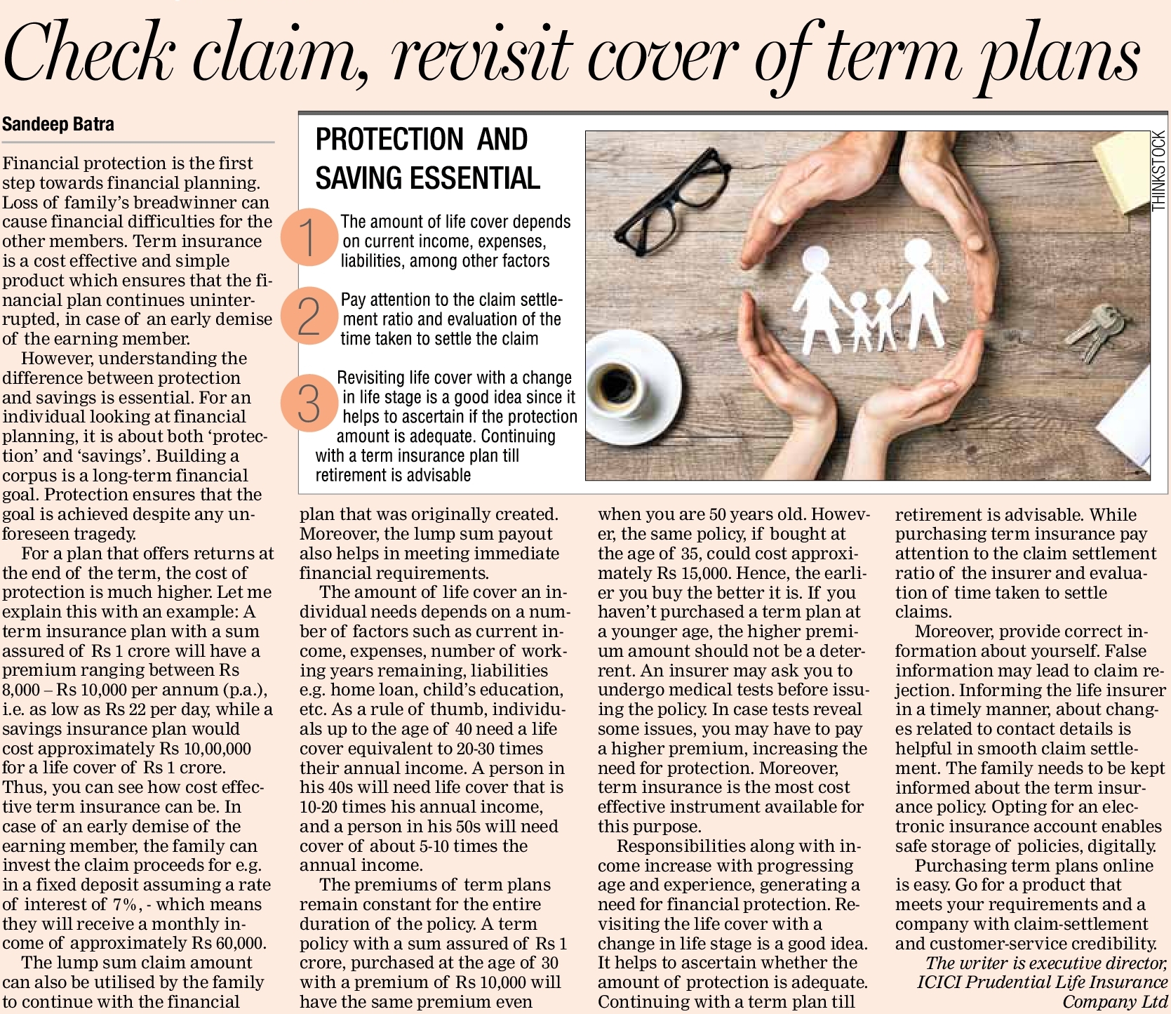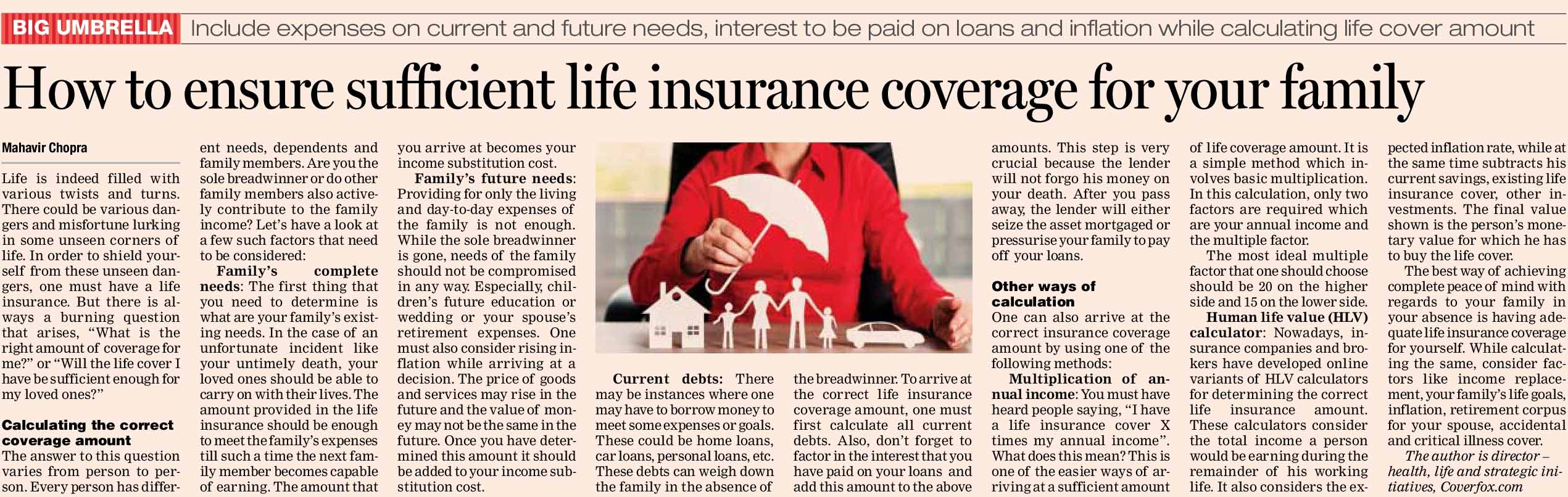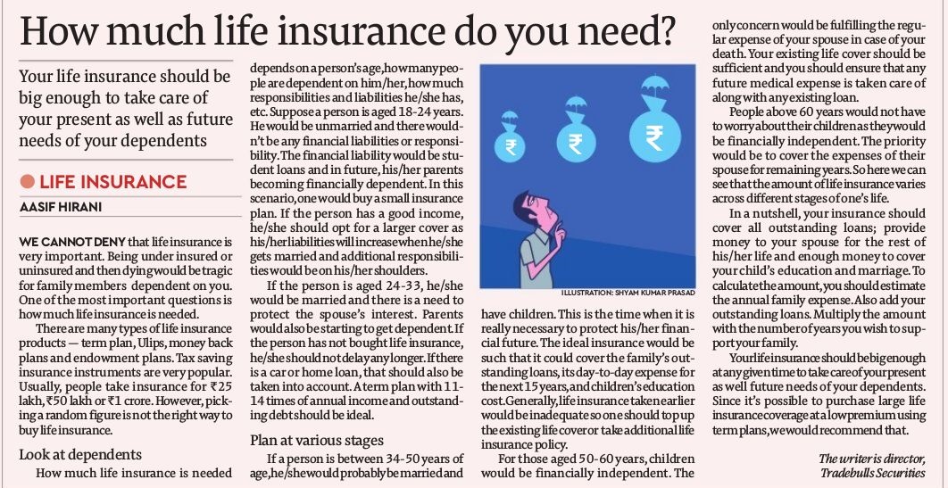 Buy a cover that continues till the time you are 60-65 years old. Also, make sure that you calculate your insurance needs carefully before deciding on the insurance amount. Take into account inflation as well as your other expenses and outstanding loans. Sanjay Tiwari, vice-president, strategy & product, HDFC Life, suggests the use of insurance calculators. These are easily available on the websites of companies and tell you how much insurance you need depending on your income and other factors, such as age.